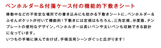 ・便利なペンホルダー&ふせんケース付 下敷きには長いペンから太いペンまで収納できるペンホルダーと、ふせんが収納できる便利なふせんケースもついていますので、あらかじめペンやふせんをセットしておけば、急な打ち合わせでも活躍できること間違いなしです。